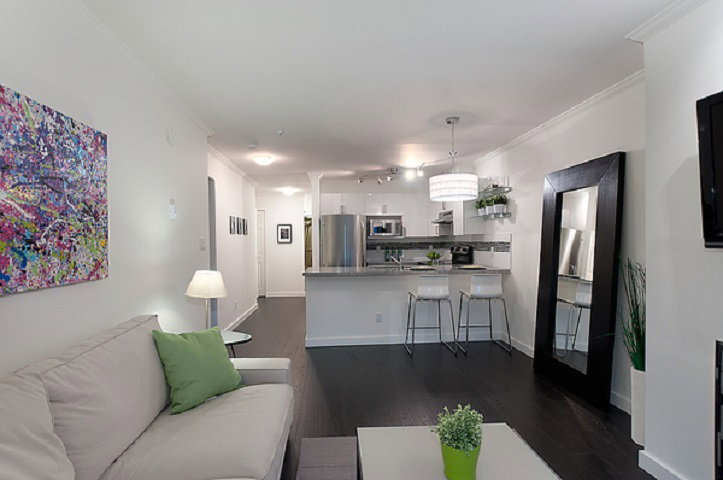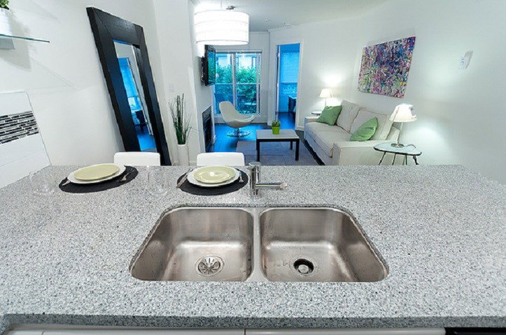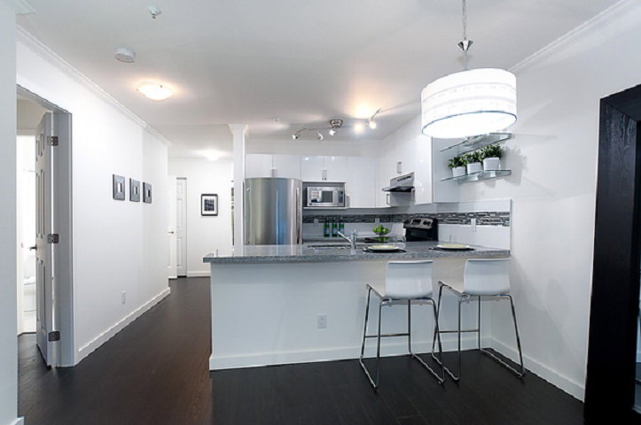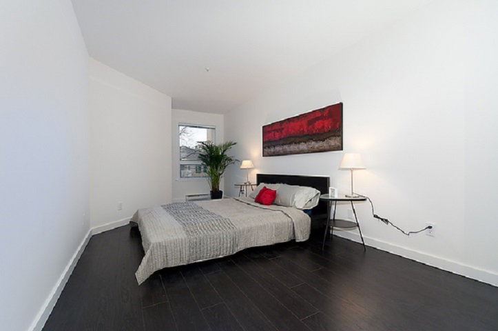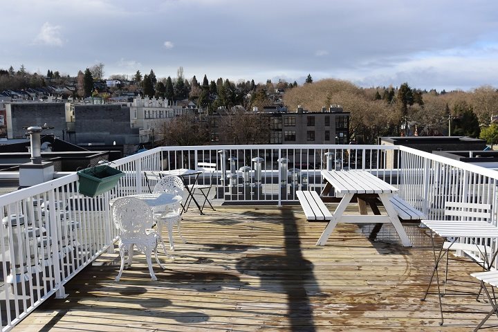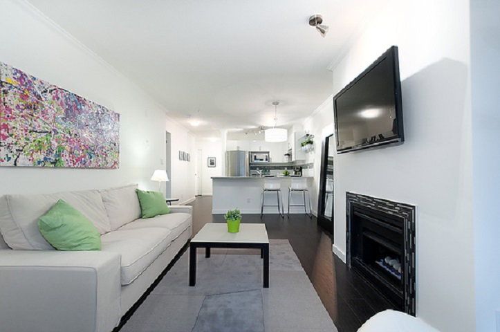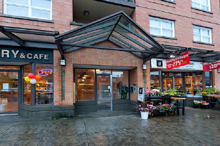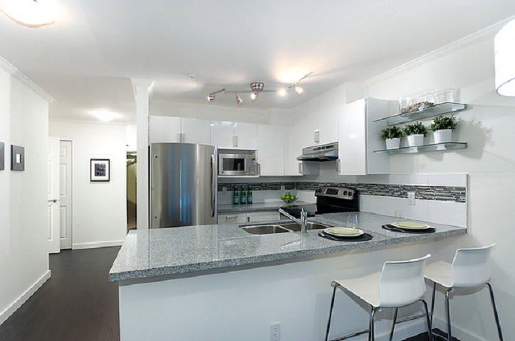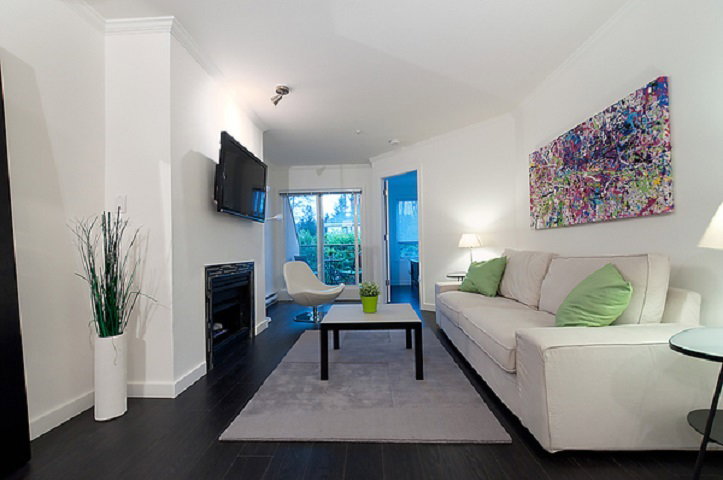 Beautifully renovated 2BR, 2BATH + den SW corner suite in unbeatable Kits location. Open concept floor plan features granite counters with double under-mount kitchen sink, breakfast bar, high end laminate floors throughout, cozy gas fireplace & in-suite laundry. Very spacious master bedroom with walk-in California closet & ensuite bathroom. Bathrooms both finished with granite counters & Italian tile. The den makes a great office or extra storage. Common roof top deck with views. Secured bike storage. 1 parking, 1 storage locker. Mere steps to B-line, all buses, shops, and restaurants. Schools, UBC, beaches, golf course & marina all close by.